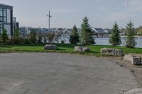 This image showcases a large parking lot in Toronto, Canada. The lot is surrounded by rocks and vegetation, providing storage and organization space for equipment. The urban design incorporates open spaces and pathways, with a road surface leading towards a building and a coastal harbor. The clear sky and clouds contrast with the green grass and trees, creating a serene atmosphere. In the distance, a hotel overlooks the ocean. This photo captures a typical day in Toronto, highlighting the city's blend of urban and coastal elements.