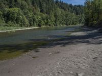 A picturesque landscape featuring a riverbank lined with trees near a grassy field. The majestic tree canopy creates a natural shadow over the elevated riverbank. The scene captures the beauty of nature on a sunny day.
