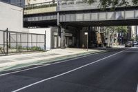 This image captures a cityscape with a person riding a bike under an overpass. The urban design is prominent with buildings and roads creating a bustling atmosphere. The road surface, made of asphalt, provides a smooth thoroughfare for vehicles. Trees provide shade along the road, adding to the city's aesthetic. The photo represents the intersection of urban infrastructure and nature, showcasing the harmony of the two elements. This is a typical scene of city life and transportation.