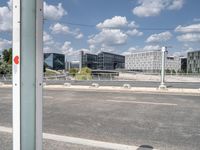 This is an image of a modern cityscape in Berlin, Germany. The photo showcases the dynamic architecture and urban design of the city's business and financial districts. The buildings are characterized by their sleek and glassy exteriors, blending seamlessly into the clear sky. The streets and roads are lined with trees, adding a touch of nature to the urban environment. The image captures the bustling city life, with cars and pedestrians filling the foreground. This photo represents the vibrant and cosmopolitan atmosphere of Berlin.