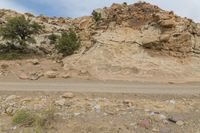 A truck drives through a desert area near the cliff face with a small rock formation in Utah, USA. The landscape features red rock mountains, dirt roads, and Aeolian landforms. The terrain is characterized by gravel, bedrock outcrops, and vegetation. The image showcases the natural environment of the San Rafael Swell region in Utah. The gloomy grey sky adds to the overall atmosphere of the scene.
