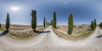 the three sides of a 360 - view photo are arranged to resemble a road with cypress trees