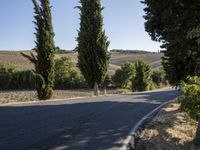 A motorcyclist rides along a scenic road in the rugged Tuscany countryside. Lush fields and towering cypress trees line the road. The clear sky and serene landscape capture the beauty of rural Italy.