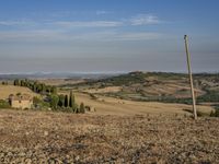 A picturesque open space in Tuscany, Italy. The rugged landscape with rolling hills and plains creates a stunning natural environment. Clear skies and a bountiful harvest add to the charm of this rural scenery.