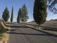 A scenic view of a rural road in Tuscany, Italy. The road surface is made of asphalt and is lined with lush green grass and vegetation. Towering cypress trees cast long shadows across the rugged landscape.