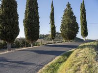 This image captures the scenic beauty of a rural road in Tuscany, Italy. The asphalt road runs through a landscape adorned with lush green grass, tall trees, and dense vegetation. The clear sky above adds to the picturesque view. The rugged terrain and the presence of evergreen shrubs and cypress trees create a unique Tuscany atmosphere. This road represents the infrastructure that connects the towns and villages in the region. The image portrays the natural beauty and charm of the countryside in Italy, making it perfect for any nature or travel-related project.