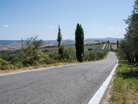 This is an image of a rural road in Tuscany, Italy. The asphalt road winds through a rugged landscape with clear skies above. The scene showcases the natural beauty of the Tuscany countryside, with olive trees and gardens lining the road. This photo captures the essence of rural life in Italy, with its picturesque scenery and charming villages. It represents the peace and serenity of nature in Europe's Tuscany region.