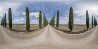 A rugged road in the heart of Tuscany, surrounded by lush vegetation and towering trees. The straight path leads to a secluded lodgepole pine forest. A picturesque view of Italy's natural beauty.