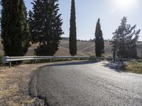 This image showcases a scenic country road in Tuscany, Italy. The road, made of asphalt, curves through the rugged landscape, surrounded by tall trees and green hills. The clear sky and bright sunshine illuminate the picturesque surroundings. In the distance, an Armco barrier can be seen, adding to the rural charm of the scene. This photo captures the beauty of the Tuscany region, known for its stunning nature and charming countryside. It represents a peaceful and serene day in the Italian countryside.