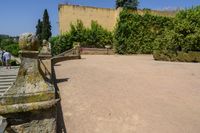 This stock photo features two people walking next to a fence on a path in a park in Cordoba, Spain. In the background, you can see buildings and trees growing next to the walkway. The clear sky and nature surroundings create a peaceful and recreational atmosphere. The path is made of gravel and dirt, providing a natural surface for the walk. It is a sunny day, perfect for enjoying the outdoors in this beautiful city of Cordoba, Spain.