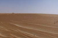 This image captures the vastness of the Liwa Desert in the United Arab Emirates. The rugged landscape features open space, dunes, and a clear sky. The horizon stretches out, creating an expansive view. In the foreground, a small boat is seen, highlighting the contrast between the land and a mode of transport typically associated with water. The sand-covered surface evokes the Aeolian Landforms found in this desert. This photo represents a typical day in the Liwa Desert, with no trees or bushes in sight.