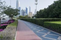 A walkway in the city park area of Abu Dhabi, United Arab Emirates. Surrounded by skyscrapers and lush vegetation, this urban public space offers a peaceful retreat. Clear skies provide a stunning backdrop to the metropolitan architecture.