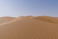 A breathtaking view of the Liwa Desert in the United Arab Emirates. The rugged landscape is dominated by vast sand dunes, creating a mesmerizing sight. Clear skies enhance the beauty of this off-road paradise.