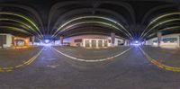 An underground parking space in Los Angeles, California. The modern architecture and straight road lines create a monochrome and low-lit atmosphere. The city's infrastructure and corporate headquarters stand tall in the background, while the artificial light illuminates the space.