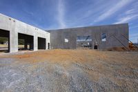 an unfinished building in the process of being built and placed on a gravel surface at a construction site