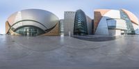 A modern architectural marvel in the heart of Los Vegas, USA. The building's unique profile stands out against the city skyline, casting hard shadows on the concrete surface. The open space around the building offers a refreshing urban design. Explore the 1/4角 and straight down the road views.