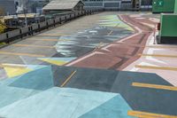 there is a large area with painted graffiti on it and a yellow parking sign above the parking space