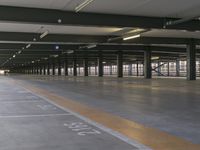 A modern parking garage in Berlin, Germany. The empty parking area is illuminated by the natural light coming through the hall's ceiling. The concrete street and composite material flooring add to the urban atmosphere.