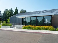 A beautiful urban landscape with a mix of architecture, buildings, and green vegetation. The sun casts shadows on the road surface, highlighting the vibrant colors of the flowers and trees.