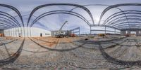 Construction site in Johnson City, Tennessee, showcasing a mix of circular structures and urban architecture. Steel cranes tower over the site, while vehicles and trucks transport materials. A busy and rugged project in progress.