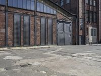 A rundown old building in Berlin, Germany, with a metal door and two doors at the top. The brick and glass walls showcase the city's urban design. The clear sky adds contrast to the city life in the Hinterhof.