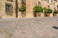 A person walking on a brick road in front of a building with several green trees in Cordoba, Spain. The classic architecture and brick wall adds to the charm of this vibrant city. This image captures the essence of a sunny day in Cordoba, showcasing the beauty of its urban landscape and architectural marvels. It could be a perfect representation of the city's museum district or historical center.