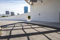 An abstract cityscape with architectural structures and residential areas. Roads and walkways curve through the urban landscape, casting hard shadows. The building's walls and floors create a unique and dynamic visual experience.