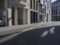 This stock photo depicts the urban architecture in Berlin, Germany. The picture features an empty street in a residential area with modern buildings, including an office building and some shops. The road is made of asphalt and is bathed in sunlight, creating a beautiful reflection on the glass windows. There is a parked car adding to the urban scene. The image showcases the vibrant and modern infrastructure of Berlin, a city known for its architectural marvels. The clear sky and white clouds provide the perfect backdrop for this picture, giving a sense of tranquility in the bustling city. A great image to use for promoting urban life, architecture, and travel in Berlin, Germany.