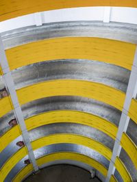 A high-rise concrete structure in the city with a yellow line running along the road. The urban architecture exhibits symmetry and features a rugged spiral. The steel arch of the parking garage adds to the overall profile.