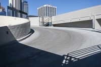 A view of downtown Los Angeles with its iconic cityscape of skyscrapers and unique architecture. The clear sky highlights the urban design and metropolitan area. A curved road leads to a parking deck and a skatepark, offering recreation in the city. Entry and exit ramps connect to the bustling highway.