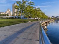 A scenic view of Milwaukee, Wisconsin. Lush green trees line the concrete streets that reflect the clear blue sky. The riverbank provides a picturesque walkway, perfect for recreational activities in this urban landscape.