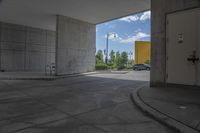 This stock photo depicts the urban architecture of Toronto, Ontario, Canada. The image showcases a cityscape with a bridge and underpass, surrounded by open spaces, trees, and vegetation. The composite material flooring and concrete walls create a modern and grey urban design. The scene is beautifully illuminated by natural daylight, casting shadows and creating an interesting play of light and shade. The photo also features a door and a parking garage. The overall composition captures the essence of urban life and the unique architecture found in Toronto.