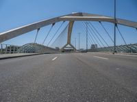 a truck driving across a bridge near a street corner near buildings and a bridge with many cables