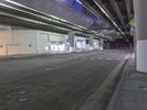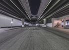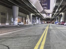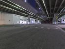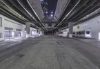 A metropolitan area at night, featuring a building with architectural design and straight roads. Three fisheye lenses capture the urban landscape with artificial light and clear skies.