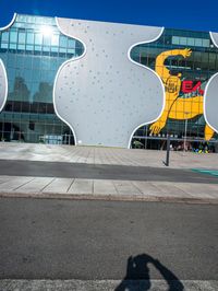 This image captures the vibrant city of Taichung, Taiwan, with its modern architecture and urban design. The clear sky provides a beautiful backdrop for the cityscape, showcasing the bustling streets and buildings. In the foreground, an asphalt road with a paver leads to the building housing the Olympic Museum. A yellow bear can be seen on the outside wall, adding a playful touch to the scene. This photo represents the energy and excitement of city life in Taiwan.