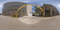A panoramic view of the urban landscape in downtown Toronto, Canada. Modern architecture with brick and glass facades create a symmetrical and inviting cityscape. Arched entrances and empty buildings add to the charm of this bustling business district.