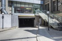 A straight road lined with modern office buildings in Toronto's busy business district. The urban design features sleek facades and a well-maintained asphalt road. The city life thrives with busy transport and loading docks.