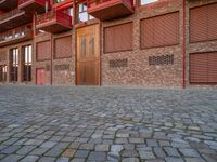Early morning in Berlin's urban residential area. Cobblestone roads lead to modern architecture storerooms. Brick walls line the streets of Europe's city life. Warehouse courtyards showcase a blend of old and new architecture.