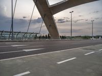 A modern bridge in Zaragoza, Spain. The urban design and architecture reflect the city's vibrant and dynamic atmosphere. Clouds fill the sky as the bustling city life unfolds below.