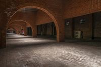 A brick walkway illuminated by artificial light is seen between two archways, creating an open space in the vibrant city of Shanghai, China. This classic architecture showcases the intricate brickwork and cobblestone surface, embodying the urban design of the city. The arches lead to a warehouse-like structure with a high ceiling, resembling a crypt or vault. The night-time tints and shades add an enchanting atmosphere to the bustling art district of Shanghai, known for its unique blend of modernity and history.
