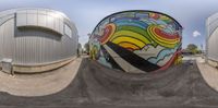 In Salt Lake City, Utah, a vibrant graffiti wall enhances the concrete street in the art district. The clear sky casts hard shadows on the road, creating a low profile. Explore the street art and storefronts in this unique urban landscape.