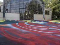 This stock photo showcases a vibrant painting on the ground near a modern architecture building in Berlin, Germany. The artwork gives a unique and colorful touch to the urban landscape. The image captures the open space in front of the building, with grass and trees adding a natural element. The clear sky above highlights the city life and the artistic atmosphere in Berlin's art district. The building's architecture features large windows and an intriguing arch, while the line of the road and the asphalt create a dynamic composition. In the background, a warehouse and a factory blend into the urban infrastructure. The courtyard serves as a public space, providing an area for relaxation and social interaction. The graffiti on the building's wall adds an edgy and urban touch to the scene. This photo perfectly represents Berlin's unique urban design and showcases the vibrant street art culture in the city's Hinterhof.