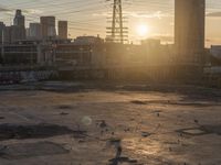A cityscape of Los Angeles at dawn, with skyscrapers and residential areas visible. The urban atmosphere is highlighted by the concrete and asphalt surfaces. The clear sky contrasts with the visible pollution and contrails, creating a rugged yet vibrant winter scene.