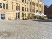This stock photo showcases the urban design in Berlin, Germany. The image features a large building in the center of a courtyard with a sidewalk attached to it. The courtyard is paved with cobblestone, adding character to the scene. Surrounding the building, there is an open space adorned with vegetation. The facade of the building showcases a mix of windows and has a distinct European architectural style. The photo is taken during the day, highlighting the details of the flooring and road surface, paved with asphalt. This image is perfect for projects related to real estate, urban design, and European cities.