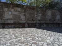 a view of a bricked concrete surface near a brick wall and trees in the background