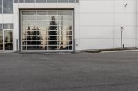 potholes in a parking lot full of water near an office building with glass windows