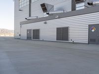 A modern architecture building in Los Angeles, California. The concrete surface and metal walls give it an urban feel. Clear sky above contrasts with the low dawn lighting. Entry features a closed air conditioning unit and loading dock.