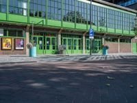 This image showcases an urban scene in Holland, Netherlands. The multicolored facade of a green building stands out against the clear blue sky. The empty parking lot, paved with green bricks, is surrounded by people walking by. The urban design of the city is visible with the road and asphalt leading to the building. This bustling city embraces a combination of modern fixtures and traditional architecture. The photo captures a typical day in Holland, highlighting the vibrant city life and the unique urban design.
