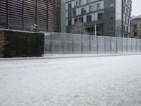 This image showcases a snowy urban landscape. The ground and fence are covered in a thick layer of snow, while buildings stand in the background. The composite material and tints and shades used in the construction of the buildings create a unique urban design. The freezing temperatures have caused the road surface to be covered in snow as well. In the foreground, the fence stands as a boundary between the snowy landscape and the urban environment. This photo represents a condominium complex with a winter backdrop.