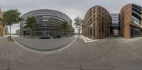 Urban scene in Hamburg, Germany, featuring classic and modern architecture. Hard shadows cast on the road with brick walls lining the urban design. Open spaces and straight roads create a harmonious city life atmosphere.